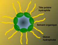 Dans le cas des micelles inversées, le principe reste le même excepté que le solvant est une matière organique: la partie hydrophobe sera dirigée vers l'extérieur, enfermant l'eau à l'intérieur.