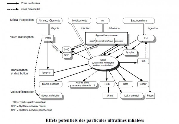 Les voies respiratoires et digestives permettraient ainsi aux nanoparticules de se répandrent jusqu’aux organes via la circulation sanguine. On peut alors penser que les nanoparticules puissent déclencher différentes maladies liées à ces organes. Cependant, l'Afssa (Agence Française de Sécurité Sanitaire des Aliments) confesse « l'impossibilité d'évaluer l'exposition du consommateur et les risques sanitaires liés à l'ingestion de nanoparticules. » Pourtant, on sait déjà que les nano-objets peuvent franchir les barrière biologiques (c'est à dire: nasale, bronchique, alvéolaire,...).